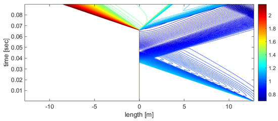The numerical calculation was carried out on a one-dimensional grid consisting of 2000 cells. Figure 8 shows the calculation results in the form of the time dependence of the flow parameters at the experimental point from the beginning of the process up to the time instant of 90 ms. For pressure (Figure 8a), good agreement of the numerical results (solid blue line) with the experimental results (red circles) is seen. Figure 8d shows that the calculated values of the saturation ratio are somewhat larger than the experimental ones in the interval from 20 ms to 40 ms. The average size of liquid droplets also differs from the experimental values, starting from 40 ms (Figure 8c), by 5%. Analysis of the calculation results shown in Figure 8a–d and Figure 9 shows that the rarefaction wave from the VK, propagating to the left, reaches the EP at the time t = 19 ms. At t = 20 ms, condensation begins at this point, and at t = 25 ms, a condensation shock appears as a result of the thermal effect of condensation (Figure 8a). At time t = 52.5 ms, the rarefaction wave reflected from the left boundary of the LPP arrives at EP, and then at t = 64 ms the secondary condensation shock arrives at EP as well (Figure 8a–c and Figure 9). At 66 ms, as a result of the rupture of the diaphragm between HPC and LPP, a shock wave is formed, which propagates to the right and reaches the EP at time t = 80 ms. A sharp increase in temperature behind the shock wave front (Figure 8b) leads to a decrease in saturation below unity (Figure 8d), the evaporation of heterogeneous droplets and, consequently, a decrease in the average droplet radius (Figure 8c) to the radius of solid particles. Figure 8b shows that the temperature jump behind the shock wave is 2% less than the experimental one.