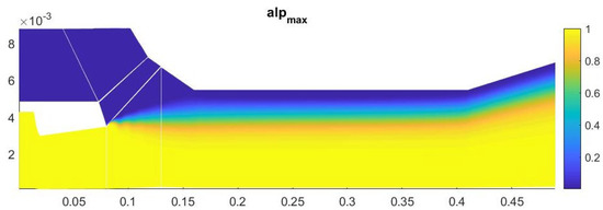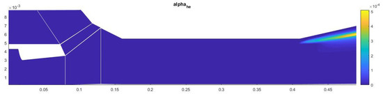 The amount of condensate on the axis of symmetry in this case is about 13% (Figure 13). Most of the heterogeneous condensation occurs in the mixing region near the wall of the second nozzle (Figure 14). In the near-wall region, condensation occurs weakly due to an increase in temperature in the boundary layer.