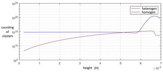 A study of the parameters at the exit from the second nozzle shows that in this device the number of homogeneous clusters is much higher than that of heterogeneous ones, which prevents the greater growth of heterogeneous droplets. This leads to the fact that the increase in the total volume of homogeneous droplets is higher than that of heterogeneous ones, at a lower growth rate of the droplet. Under such conditions, heterogeneous condensation is weakly manifested, which does not allow droplets on solid particles to grow significantly in size (Figure 15, Figure 16 and Figure 17).