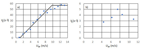 The current’s vorticity as a function of the wind speed in the upper 3 mm below the surface. (a) Data from [9], Figure 5a. Each point is based on two to four data points. (b) Data from [10], Figure 2. Each point is based on two data points.