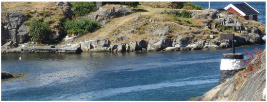 Wind-wave generation in Gamle Hellesund. Capillaries cover the dark areas. The light ribbons without capillaries are common there during rising tides, when the current flows towards the right. The wind blew towards the camera. Estimated wind speed: 5 m/s. Water temp.: 19 °C. Current: 5–10 cm/s.