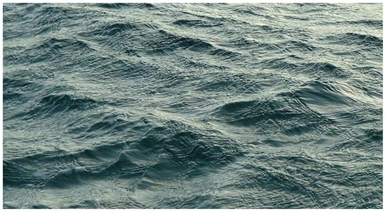 The relationship between and confirms—at least approximately—these visual observations: the shortest wavelengths are observed at the highest wind speeds, and the wavelength is approximately 3 mm at a fresh breeze, while wavelengths above 40 mm can be observed at very light winds. Figure 5 shows capillaries at an intermediate wavelength before wave–wave interactions had time to generate other waves. The wave heights seem to be approximately 1 mm or less for all wavelengths, including the capillaries in Figure 2, Figure 3 and Figure 5.