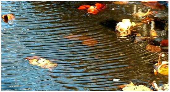 Wind-supported capillaries and autumn leaves in a pond shortly after a sudden onset of a gentle breeze. Stipulated wavelength: 7–10 mm. Stipulated wave height: 1 mm. Temp.: 0 °C.
