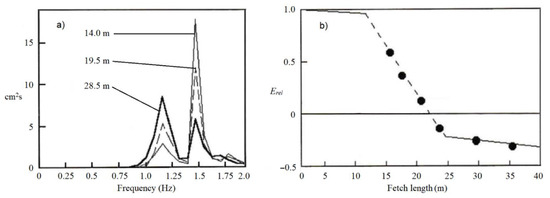Figure 7 shows graphs of downshifting of deep water, initially steep, regular waves at a frequency of 1.5 Hz. As can be seen in Figure 7a, two sideband frequencies, known from [39] as non-dissipative phenomena (spin conservation needs both frequencies), grew until breaking occurred about 10 m from the wave generator. They grew until a variable wave height implied the start of wave breaking about 10 m from the wave generator. From there, wave breaking appeared over a distance of 13 m where much of the wave energy shifted to waves at 1.2 Hz. On Figure 7b, the two slightly tilted lines show the effect of molecular dissipation, while the dotted line shows the effect of wave breaking. It is about twenty times steeper than the two other lines and indicates that the dissipation in this case was an order of magnitude stronger than molecular dissipation.