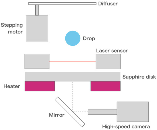 The drop impact processes were observed using a high-speed camera (Fastcam SA-Z, Photron Limited, Tokyo, Japan) equipped with a long working distance microscope (Z16-APO, Leica Camera Japan Co., Ltd., Tokyo, Japan), as shown in Figure 1. A key trick to clearly observe the rim breakups is the diffuser rotating with a stepping motor. When a drop is about to impact the substrate, the laser sensor triggers the stepping motor to rotate a tracing paper and diffuse the back light. In this way, the diffuser did not interrupt a drop from falling from the needle.