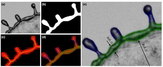 Image processing to obtain local thickness of the rim and the ligament. (a) Original image, (b) binarized image, (c) center line, (d) circles having the centers along the centerline and radii to fit to the boundary, (e) resultant circles fitted to the rim (green) and the fingers (blue).