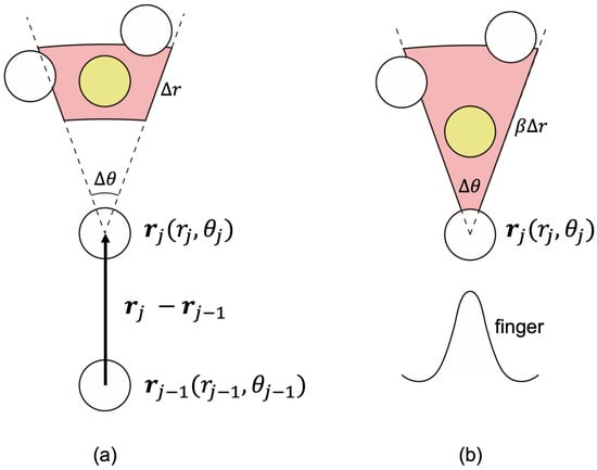 After obtaining the area and positions of drops separated from the rim in all the frames, we linked the identical drops in consecutive frames by using the PTV method. Figure 3 illustrates the concept of linking drops between frame j and . We first filtered out drops whose area is either smaller than or greater than in the search region with S being the area of the drop in frame j. We then determined that the target drop in frame is the one that has the closest distance from the center of the search region. Here, the center of the search region, , was given by the position vectors of the same drops in the present and the last frame, i.e., . The search region has some extensions in radial and azimuthal directions, and ; see Figure 3a.