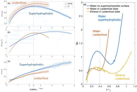 Figure 5 shows that is smaller and is larger in Leidenfrost state than on SHPB surface. shown in Figure 5b crosses during the spreading phase. The error bars on Figure 5a represent the standard deviation of ten impacts. The larger error bars for Leidenfrost state reflect the poor reproducibility due to the local contact of the spreading film caused by the partial cooling of the sapphire substrate [16]. The local contacts are visualized in the right panels of Figure 5c,d as dark spots.