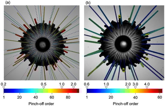 Examples of the PTV result are shown in Figure 6 for (a) Leidenfrost state and (b) on SHPB surface. Note that all frames in the initial stage of an impact, taken at 20,000 fps, are superimposed. Outlines of the generated drops are shown by the circles. The color of the circles changes based on the pinch-off order from blue to red, as shown by the color contours. Note that several typical times are also shown in ms on the top by triangles to estimate the pinch-off time.