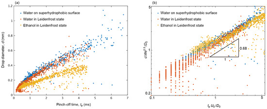 Diameters of daughter drops plotted as a function of pinch-off time, , from the rim expanding on a superhydrophobic or superheated surface above Leidenfrost point. The same data are shown on (a) linear axes with the dimensional ones and (b) double logarithmic in dimensionless forms. The characteristic length scale, , in (b) is the measure of the maximum spreading diameter of the mother drop [11].