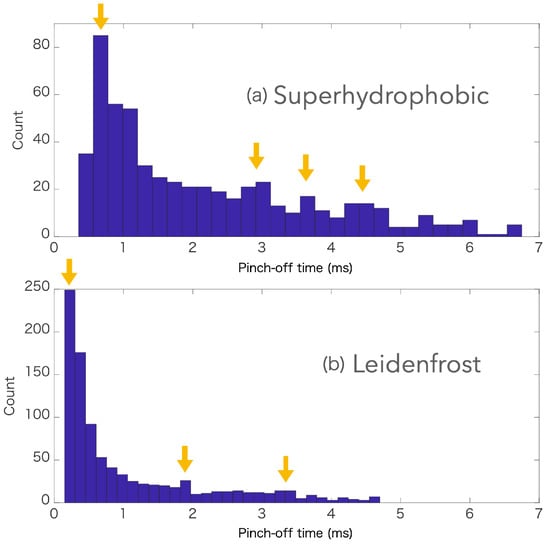 The collapse on a function of pinch-off time (Figure 8) for datasets that differ in drop size distribution (Figure 7) suggests that the daughter drops pinch off the mother drop earlier in Leidenfrost state than on SPHB surface. This is confirmed with the histogram for the pinch-off time shown in Figure 9. The figure also shows an interesting characteristic of the rim breakup where the pinch-off frequency decreases not monotonically but with several peaks, as shown by the arrows, which is the characteristic of the unsteady atomization where drops pinch off when the local exceeds a critical value [22,23]. However, as shown in the previous section, the critical s differ on SH and on SHPB surfaces.