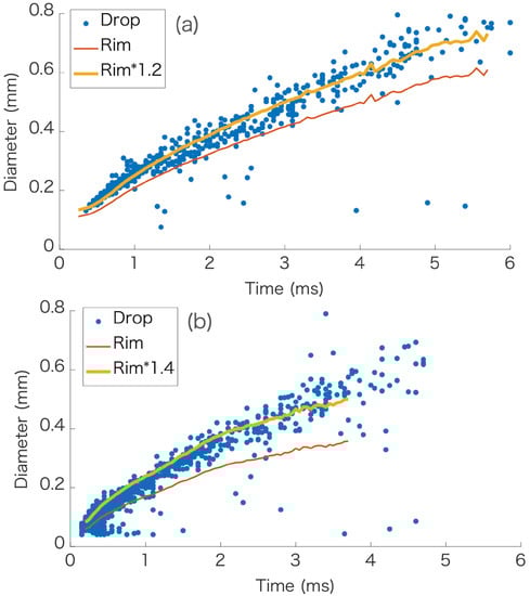 However, when the diameter data in Figure 7 are plotted as a function of pinch-off time, all the data surprisingly collapse on a single curve, as shown in Figure 8. The log–log plot of the daughter drop diameter, , shown in Figure 8b, reveals that , where represents the pinch-off time. The scaling was originally derived in Visser et al. [27] not for the daughter drop diameter, , but for the rim diameter, , of impacting drops. The coincidence in the scaling law between and suggests , which will be proved in the following. Note here that the thickness of the rim, , from which the daughter drops pinch off follows the different time evolution on SH and SHPB surfaces, as already shown in Figure 5.