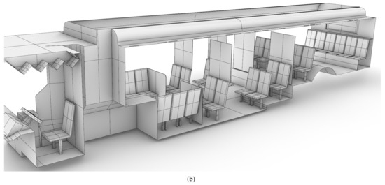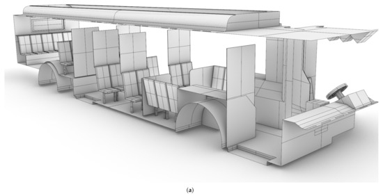 A CAD model of a standard Charlotte Area Transit Systems (CATS) bus, as shown in shown in Figure 1, was generated based on detailed measurements performed by the authors, with the assistance of CATS operators and management. The CAD model was then verified against the Gillig low-floor bus model layout obtained from CATS through an NDA between UNC Charlotte and CATS; bus HVAC operating condition data were also obtained through the same NDA. Note that the Gillig low-bus bus model is the most common variant of CATS buses. This bus is approximately m (L × W × H). There are 25 seats for passengers in the main cabin, and the seating at the rear of the bus is elevated.