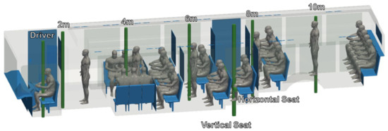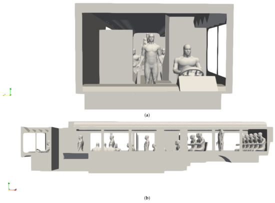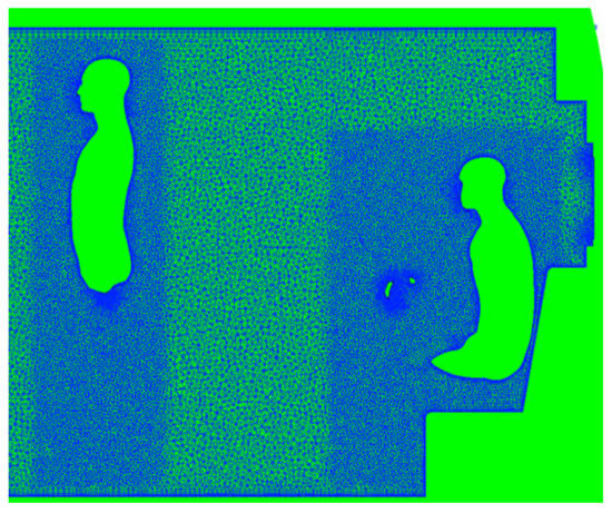 Conformal grids were created for each bus/passenger combination using a commercial software ANSA by Beta CAE (Luzern, Switzerland).All surfaces were meshed with triangular elements, including the passenger models (Figure 3). Prism layers were grown from the surfaces to capture near-wall gradients, and tetrahedral elements were used in the remaining volumes, see Figure 4. Inside the bus, the maximum cell size (surface and volume) was 25 mm, with additional refinement around the curvature and regions of interest. As shown in Figure 4, on passengers, the maximum surface cell size was 15 mm, with cell sizes of 5 mm near noses and mouths. Volume mesh refinement regions limited volume cell sizes within 100 mm of each passenger to 15 mm.