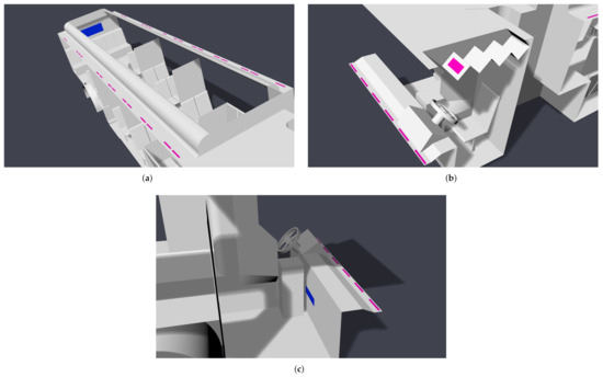 Location of modeled HVAC components; registers are colored pink, and returns are colored blue. (a) Main cabin; (b) driver; (c) defroster.
