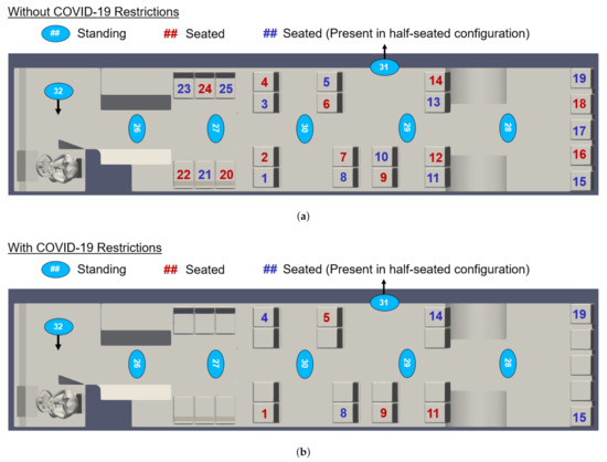 Map of bus interior showing the location and numbering convention of passengers (a) without and (b) with the current COVID-19 occupancy restrictions. Note that passengers 31 and 32 are only included in simulations in which the doors are open. In the half-seated configuration, only the blue-seated passengers are present.