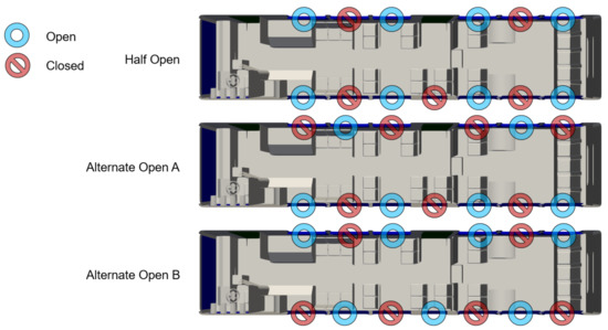 Depending on the weather conditions, CATS can open some or all of the windows on the bus. We consider several scenarios: All windows fully shut, all windows fully open, half of the windows fully open, and two mixed configurations labeled as “alternate open A” and “alternate open B”. The first two configurations are obvious, however, the latter three configurations are shown in Figure 7.