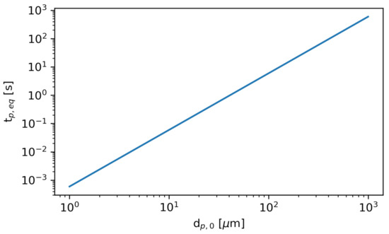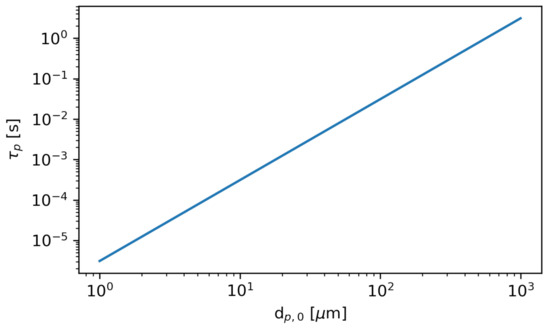 The stopping time as a function of initial particle diameter . The particle density is constant at . The fluid dynamic viscosity is computed using Sutherland’s Law (see Equation (1)) at the initial bus temperature .