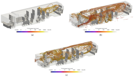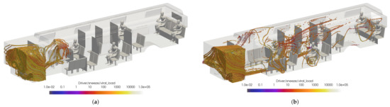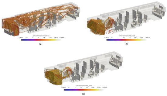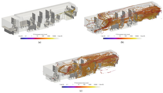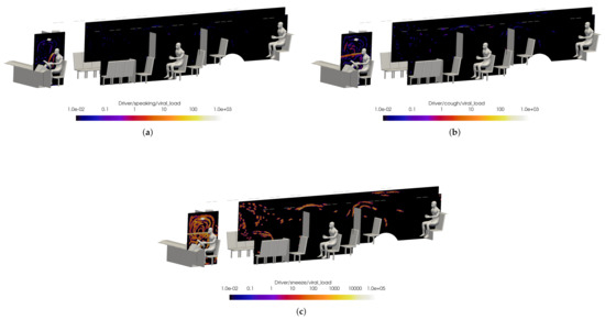 Figure 18 shows slices taken through the domain and centered on the driver. It can be seen in Figure 18a that the overall flow is toward the rear of the bus, as indicated by the positive x-direction velocity. Also, Figure 18c shows that the injection of air from the defroster is also clearly visible in the z-direction velocity. For all injection events, the viral load is most concentrated in the area immediately in front of the driver. This is because most of the viral load is contained in the largest particles which have the most inertia and are therefore least affected by the flow dynamics; they are also the largest and therefore drop rapidly due to gravity.