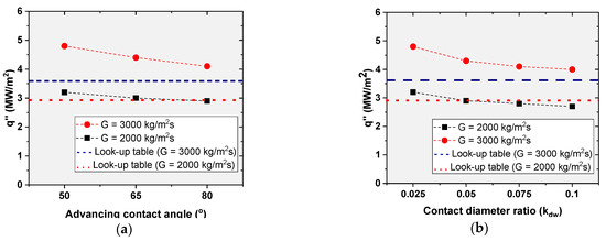 (a,b) represent variation in predicted DNB value with different advancing contact angles and contact diameter ratios, respectively. The values predicted by the Look-up table [5] are also plotted for reference. (adapted from Vadlamudi and Nayak [41]).