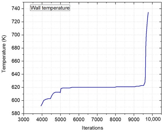 Firstly, the simulation has been initialized with a low heat flux value to ensure numerical convergence. It is executed for sufficient iterations until it reaches a converged steady-state solution. Subsequently, the heat flux has been increased in small steps, and the solution is allowed to converge at each heat flux. This process of increasing the heat flux has been repeated till an abrupt rise in wall temperature, indicating the occurrence of DNB. Figure 3 shows a typical DNB plot.