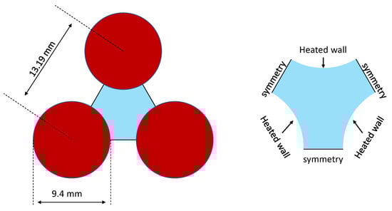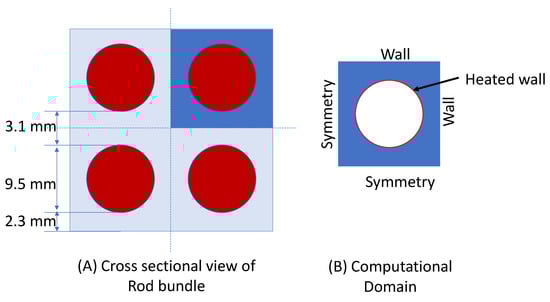 For tubular geometry, two-dimensional axis-symmetric simulations have been carried out to simulate DNB. In addition, three-dimensional CFD simulations have been performed for rod bundle simulations. The schematic of the cross-sectional geometry of the computational domain for square lattice is shown in Figure 4. The 2 × 2-rod bundles have been simulated using two symmetry boundary conditions and two wall boundary conditions, as shown in Figure 4. The effect of non-mixing vane spacers has not been considered as the spacers were small and sparsely placed. Three different meshes (1.5 million, 2.5 million, 3 million) have been considered, and no significant difference has been observed in the results.