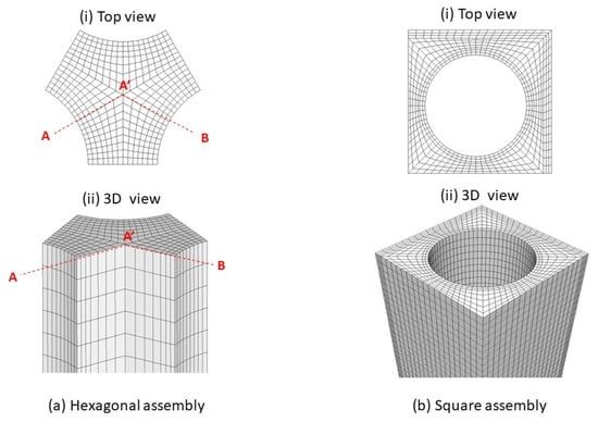(a): (i) top view of mesh distribution (0.16 million) in hexagonal assembly, (ii) corresponding 3D view of mesh distribution in hexagonal assembly. The portion enclosed by planes A–A’ and A’–B corresponding to the top view in (i) has been removed in (ii) to show the internal mesh distribution. (b): (i) top view of mesh distribution in square assembly (2.5 million), (ii) corresponding 3D view of mesh distribution in square assembly.