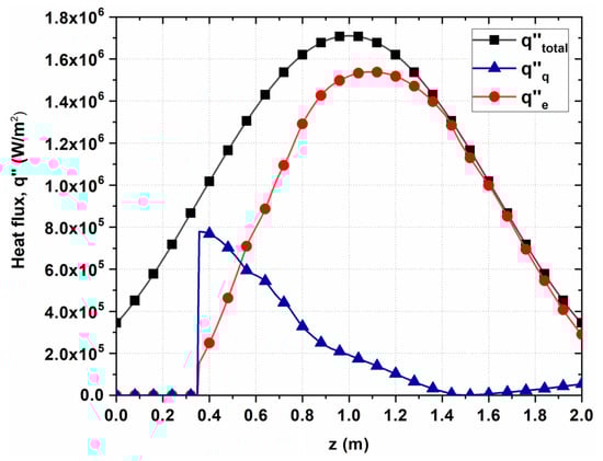 Variation in total applied heat flux, evaporative heat flux, and quenching heat flux with axial length (135°).