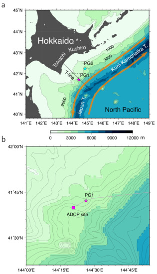Knowledge of mid-depth and deep currents is quite limited, in comparison to sea- and near-surface currents. It is because current velocity data are derived from “snapshot” data, such as geostrophic velocity calculations based on hydrographic data [7], lowered acoustic Doppler current profiler (ADCP) observations [8,9,10], and moored current meter observations [11]. Even mooring observations have data coverage lengths of 2 years at most, with limitations of the installed battery life and data storage [12,13]. Thus, variations on timescales of years and longer cannot be fully understood. The exception is the bottom pressure observation in the region off the southeast coast of Hokkaido, Japan. By using data at stations PG1 (41°42.076′ N, 144°26.486′ E) and PG2 (42°14.030′ N, 144°51.149′ E) (Figure 1a), recorded over periods of 10 years and longer, Hasegawa et al. [14,15] found that the interannual variation in bottom pressure is related to atmospheric variations that originated in the tropical dominant variation, i.e., the El Niño–Southern Oscillation (ENSO).