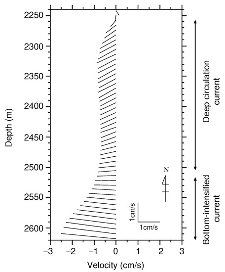 Deep and bottom currents are critical factors in oceanographic researches and ocean engineering. For example, bottom currents suspend sediments from the seabed [1]. Besides short-term sediment gravity flows [2], the cumulative effects of long-term variations in deep and bottom currents, even those that are very weak, are thought to have substantial impacts on the distribution of suspended sediments, e.g., [3]. In addition to corrosion, deep and bottom currents impact the construction and maintenance of marine and offshore structures and deep sea drilling, e.g., [4]. Flows around marine structures produce Kármán vortices, which induce vibration of marine structures and generate turbulence, e.g., [5,6]. Such periodic and random vibrations could seriously damage structures and their functions. Accordingly, knowledge of deep and bottom currents is prerequisite to construct marine structures and perform deep drilling.