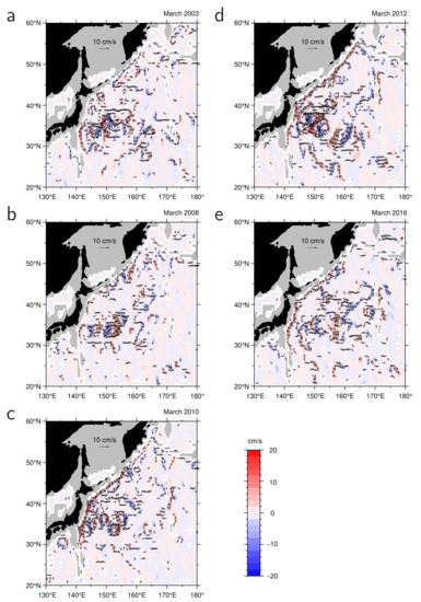 Furthermore, as clearly shown in Figure 2b, the northward component of the bottom-intensified current extended upward, reaching a level shallower than 2400 m depth on an interannual timescale, as in the winters of 2007/2008, 2009/2010, 2011/2012, and 2015/2016. During the study period, the current thickness varied within a range from approximately 50 m during the 2002/2003 winter to 350 m during the 2015/2016 winter. For example, the OFES current velocity fields at a depth of 2349 m (horizontal dashed lines in Figure 2), in periods marked by arrows in Figure 2, are shown in Figure 4. The diminished bottom-intensified current in March 2003 had no single continuous current along the trenches (Figure 4a). Except for March 2008, the extended bottom-intensified current featured a narrow (~50 km) northward and northeastward current, exceeding , along the Japan and Kuril–Kamchatka trenches (Figure 4c,d). In March 2008 (Figure 4b), the bottom current was vertically extended but the current speed produced by the OFES was quite low. Accordingly, this suggests that the bottom-intensified current frequently becomes elongated and trapped along the onshore continental slope of the trenches, in association with upward extension. However, we note that the OFES does not produce quantitatively accurate velocity and may not be able to sufficiently resolve the cross-shelf structure of the bottom-intensified current. The mechanism of the vertical extension of the current will be discussed in Section 3.3.