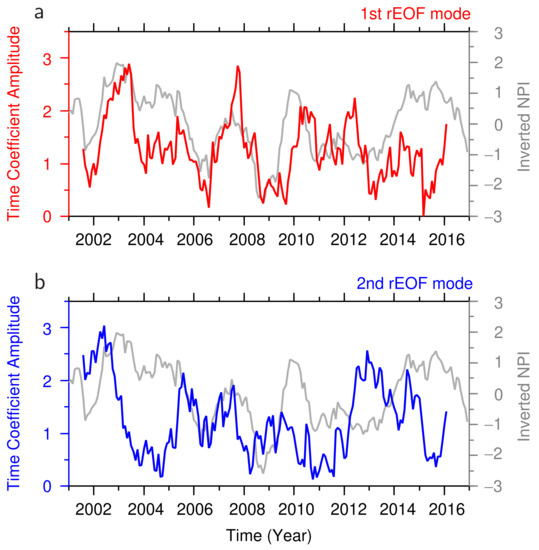 The time coefficient of the first rotary EOF mode exhibits interannual variation, with significant positive peaks in the winters of 2002/2003, 2007/2008, 2009/2010, 2011/2012, and 2015/2016 (Figure 6a). Most of these positive peaks lag behind the positive peaks of the inverted NPI anomaly (gray line), which represent the strengthening of the Aleutian Low, principally due to the occurrence of El Niño events, e.g., [34]. With a lag of 3 months, the correlation coefficient between the first rotary EOF mode and inverted NPI anomaly reaches a maximum of , which is higher than the 99% confidence limit () and, therefore, statistically significant. The time-lag is unexpectedly shorter than the time lag (30 months) between the sea surface height variation at PG1 and inverted NPI anomaly, calculated by Hasegawa et al. [14]. This very short time lag suggests that the vertical extension of the bottom-intensified current is brought about by a barotropic response in the central Pacific to ENSO-related wind variation, which is relatively rapid, in comparison to the baroclinic response [17].