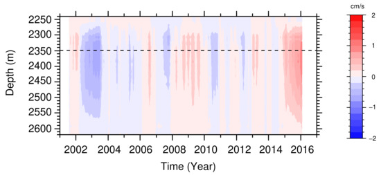 We corrected the current directions using the annual difference between true north and geomagnetic north, on the basis of the 12th generation of the International Geomagnetic Reference Field [26]. The data were interpolated onto grids at intervals of 8 m, from 2242 to 2618 m depths. The nominal accuracy of the ADCP data is 1% of the velocity, or (Teledyne RD Instruments). The accuracy was for the observations reported here because the observed range of current speeds was less than 10 . In this study, we calculated monthly mean values. Therefore, the random error is less than by monthly averaging. To examine the interannual variation in current velocity, we further smoothed the data by a 15-month running mean filter.