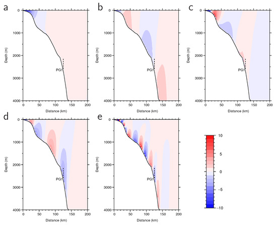 Sections of the eigenfunctions of the along-slope current velocity component for the (a–e) first to fifth coastal-trapped wave (CTW) modes, with a wavenumber of at the T-line in Figure 1. The vertical dashed lines show the vertical range of the ADCP observation at PG1.