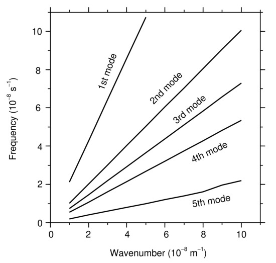 Dispersion relations of the lowest five coastal-trapped wave (CTW) modes at the T-line in Figure 1.