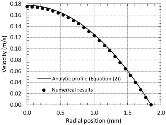 In Figure 3, it is possible to verify the good agreement between numerical results and analytic profile (mean relative error range between 2.4% and 2.6% for the three velocities), which concludes that the numerical model predicts the local properties of the studied flow well.