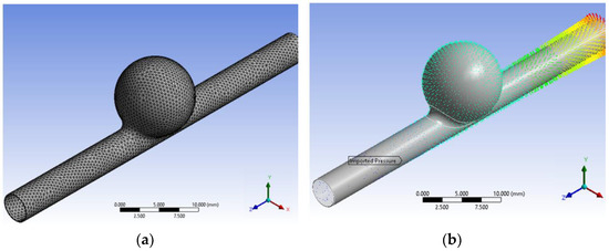 In this work, numerical simulations were performed by combining both fluid flow and structural analysis [50,51] using Ansys® software. The fluid flow analysis simulates the blood flow inside the vessels, and the resulting pressure in the vessel wall was analyzed for mechanical deformations occurring in the vessel wall as well as in the aneurysm. The existence or absence of the recirculation phenomenon in different Reynolds numbers (Re) was studied, and it was possible to visualize and analyze the development of the fluid recirculation phenomenon inside the aneurysm. Finally, the numerical characterization of the biomechanical behavior of aneurysms was carried out.