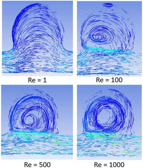 The hemodynamic pattern was analyzed, and similarities were found between all the studied flows (distinct inlet velocities and different rheological models). Figure 6 illustrates the flow behavior for the four Re analyzed in the central plane at x position (x = 0). It is clear that for Re = 1, the flow makes a smooth curvature, bypassing the geometry of the aneurysm wall; in this case, there is no recirculation. However, for the other Re, which has much higher flow velocities, recirculation inside the aneurysm is noted, which is more pronounced as the number of Re increases.