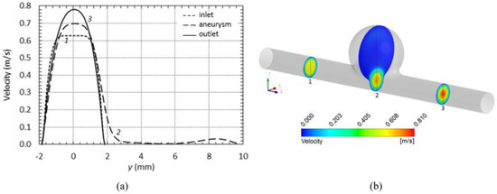 The profile represented by line 2 in Figure 8 illustrates well the lower velocities in the aneurysm. Moreover, it is possible to verify a little shift of the maximum velocity in the bulge direction.