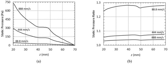 (a) Static pressure along the channel for Carreau model and different velocities. (b) Ratio between static pressure for Carreau and Newtonian models.