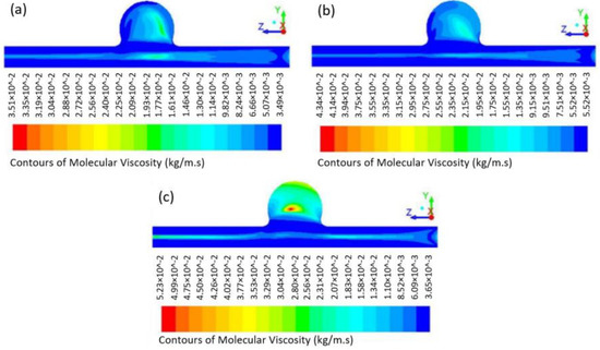 Viscosity in the central plane (x = 0) for non-Newtonian flows and distinct velocities. (a) u = 888 mm/s; (b) u = 444 mm/s; (c) u = 88.8 mm/s.