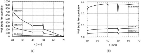 (a) Static pressure along the wall for Carreau model and different velocities. (b) Ratio between wall’s static pressure for Carreau and Newtonian models.