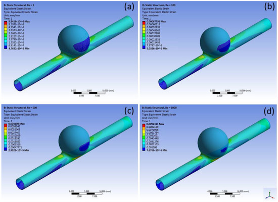 Equivalent Elastic Strain: (a) Re = 1; (b) Re = 100; (c) Re = 500; (d) Re = 1000.