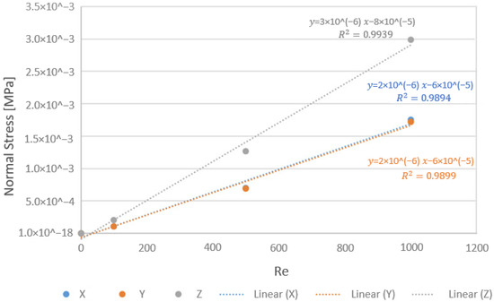 In addition to displacement and strain, normal stress and shear stress values were also computed. Next, the images of shear stress (Figure 15) and normal stress (Figure 16) for the highest Re (Re = 1000) and the graph of normal stress for all analyzed Re (Figure 17) are presented.