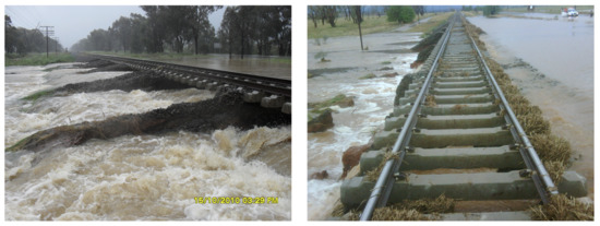 - Tsubaki, R.; Kawah, Y.; Ueda, Y. Railway Embankment Failure due to Ballast Layer Breach Caused by Inundation Flows. Nat. Hazards 2017, 87, 717–738. [Google Scholar] [CrossRef]