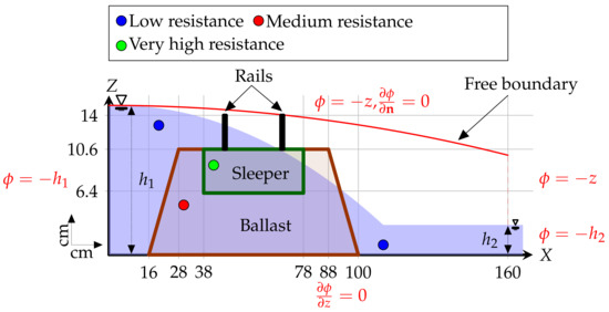 Theoretical and experimental work on the flow of water through the ballast has been reported by [3], who investigated the effect of fouling on the conductivity of railway ballast. This study only calculated the flow through a realistic ballast numerically and did not report any experimental research, although they determined the permeability experimentally. Moreover, their analysis did not account for the free boundary, which is critical to understanding fluid flow. However, it represented the first attempt to model this challenging problem. This work was the starting point for the work of [4], which extended the work of [3] to the case of variable ballast properties and a free surface. However, this work assumed that the free surface was within the ballast itself and could not account for a free surface that extended in any way above the ballast. Such a case occurs both for realistic ballasts and for the experimental studies in the literature. We also note that Darcy’s law was assumed in both [3,4], which is a simplification. More complex fluid models have been considered by [5,6]. These more complex models allow for more complicated fluid flows and more complicated porous media laws. However, they require much greater computational power, and they are also time-dependent and not easily adapted to constant flow problems which appear in typical ballast scouring models [3] and the experiments we examine here.