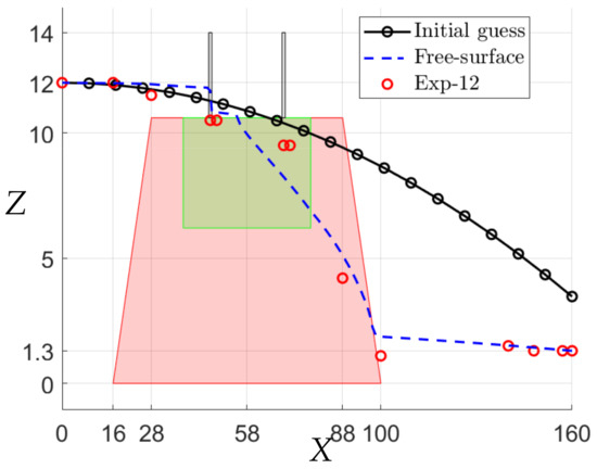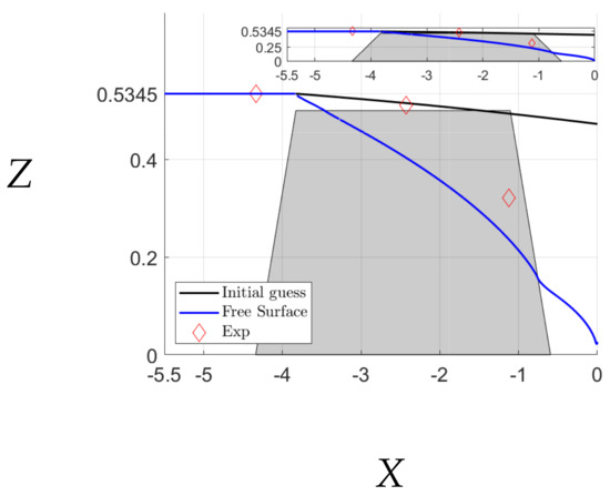As the properties of the ballast and sleeper required for our study were not reported, we have some freedom in choosing them. The results that best matched the experimental observations were , 0.7, and 100 cm/s for the ballast, sleeper, and fluid outside the ballast domain, respectively, as shown in Figure 6, Figure 7, Figure 8 and Figure 9. The convergence of the iterative method is shown in Figure 6 when the height of the flow was 10 cm. There is a low error between the free surface we calculate and the experiment of [10], and the error rate is less than , as shown Table 2. By using the same method for the Tsubaki experiment Figure 5, we obtain approximately the free surface as shown in Figure 10 and Figure 11 for a different flow rate. We have chosen the hydraulic conductivity of the railway ballast equal to 0.34 m/s since it has the same gradations as the clean ballast in Figure 3 and 1 m/s for the flowing outside. The stable boundary in Figure 5 may have affected the result for the free surface in Figure 11, but we can still see convergence if we pay attention to the axis in Figure 11.