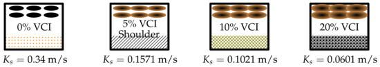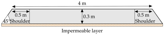 The Tsubaki’s experiment [5] involved many types of railway ballast. We focus on the case of ballast without sleepers and rails since their dimensions were not reported in the study. The study was conducted with a realistic railway ballast, and the gradient of this ballast according to [5] is identical to the distributions of particle sizes as for clean ballast in Figure 3. Therefore, the hydraulic conductivity equals 0.34 m/s. We present a schematic of the experiment in Figure 5.