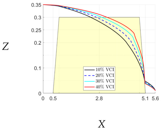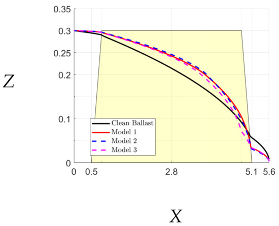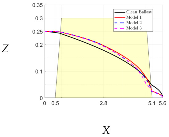 where (VCI) is the void contaminant index, is the speed of hydraulic conductivity for a clean ballast, and is the speed of hydraulic conductivity for crushed ballast fines (as fouling material), which is m/s. The hydraulic conductivity for the ballast is 0.34 m/s based on measurements for a clean ballast, and for the flow outside the ballast region, we assume 1 m/s. The flow starts at to , and the ballast’s width is . We examine different heights for the flow. The free surface for the railway ballast is shown in Figure 15, Figure 16 and Figure 17, where for all of them. We can see the influence of the VCI on model 1 Figure 13 The affect on the free surface is shown in Figure 18. We have increased the height of to 0.1 m to obtain the convergence for the VCI.