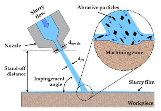 The development and mastery of finishing processes for creating high-precision optical surfaces are challenging. The fabrication of high-precision optical surfaces generally involves several processing steps, including milling [1], grinding [2], polishing [3], and final finishing. Fluid jet polishing (FJP) [4,5] is a machining process in which abrasives (ceria, alumina, silicon carbide, or diamond particles with a diameter < 10 µm) and a carrier fluid (typically water) are adequately premixed and pumped through a nozzle. The resulting jet beam impinges the working surface either perpendicularly or at an impingement angle, allowing individual abrasive particles within the carrier fluid to impact the workpiece surface. The release of the kinetic energy of the abrasive particles results in variable material removal rates through the control of process parameters [6,7,8]. FJP is an ultraprecision finishing technology that merges fluid dynamics, precision manufacturing, and surface engineering, and has high adaptability to be applied for generating complex free-form shapes [9] and the ultraprecision polishing of optical lenses, mirrors, and molds [10]. Figure 1 presents a sketch of the FJP process. The material removal mechanisms are influenced by several process parameters and material characteristics, as shown in Figure 2.